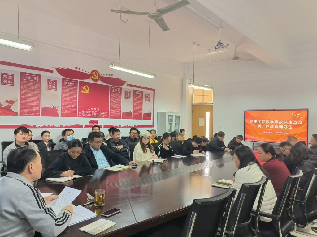 会上,宋书记带领全体教职工深入学习《中共球友会委员会师德师风负面清单与失范行为处理办法》。他结合实际,逐一对师德师风负面清单范畴进行详细解读,引导教职工知敬畏、存戒惧、守底线。随后,会议学习了《球友会教学事故认定及调、停课管理办法》。宋书记围绕教学事故的具体认定情形及处理办法展开深入讲解,针对排课规范、调课流程、停课管理等关键问题进行重点强调。他指出,教学是学院发展的生命线,全体教职工要严格遵守教学管理规定,共同维护教学秩序。