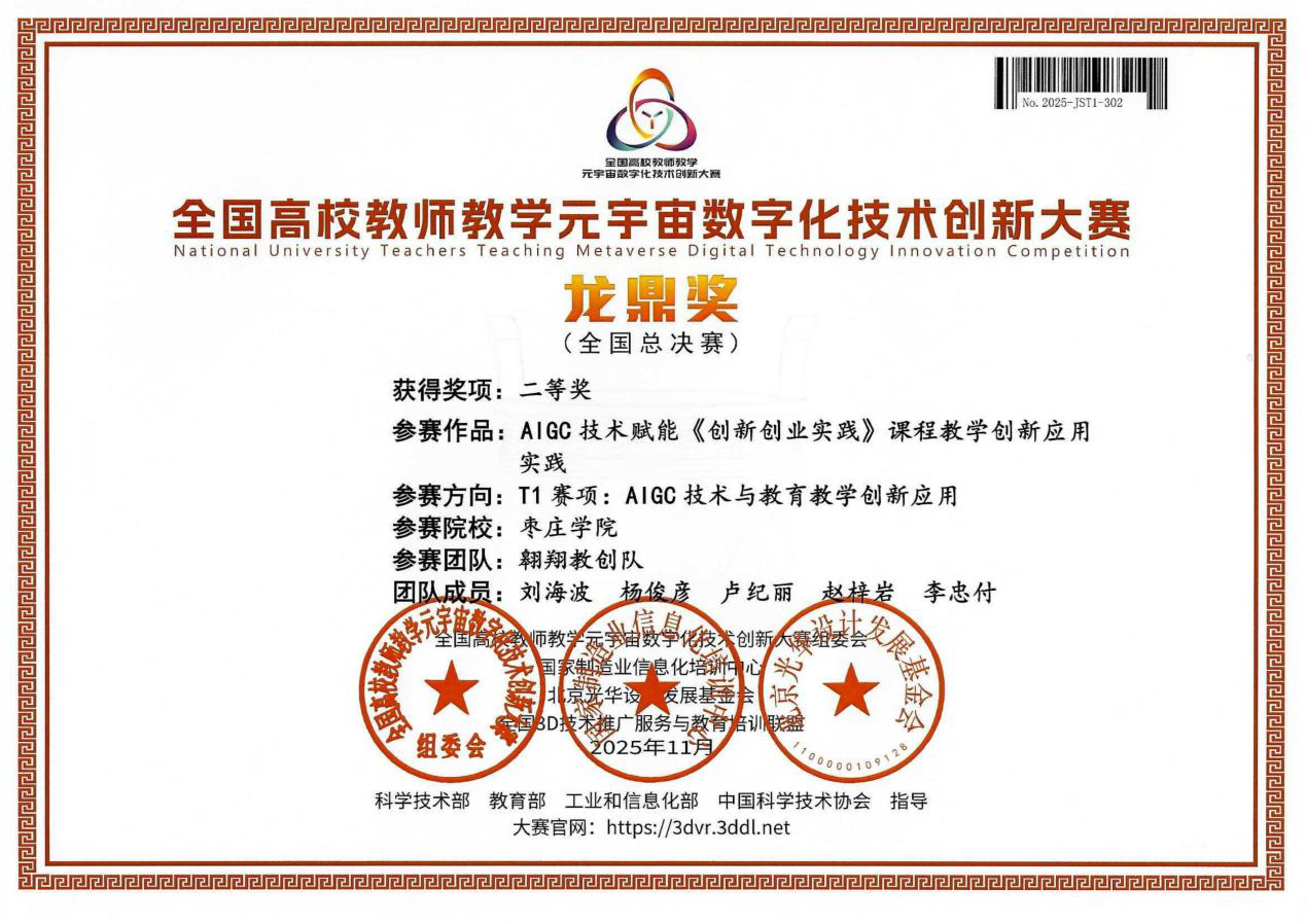 近日,2025年第6届全国高校教师教学元宇宙数字化技术创新大赛全国总决赛圆满落幕。我校球友会由刘海波、杨俊彦等教师组成的教学团队,凭借《AIGC技术赋能创新创业实践课程教学创新应用》成果,在T1赛项“AIGC技术与教育教学创新应用”赛道中表现突出,荣获全国总决赛二等奖。