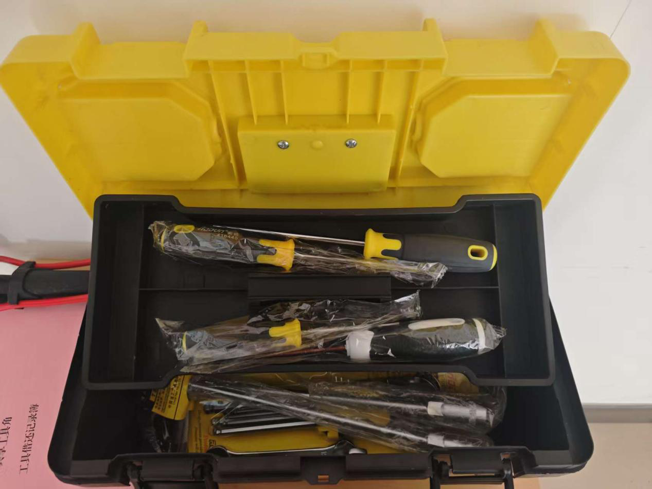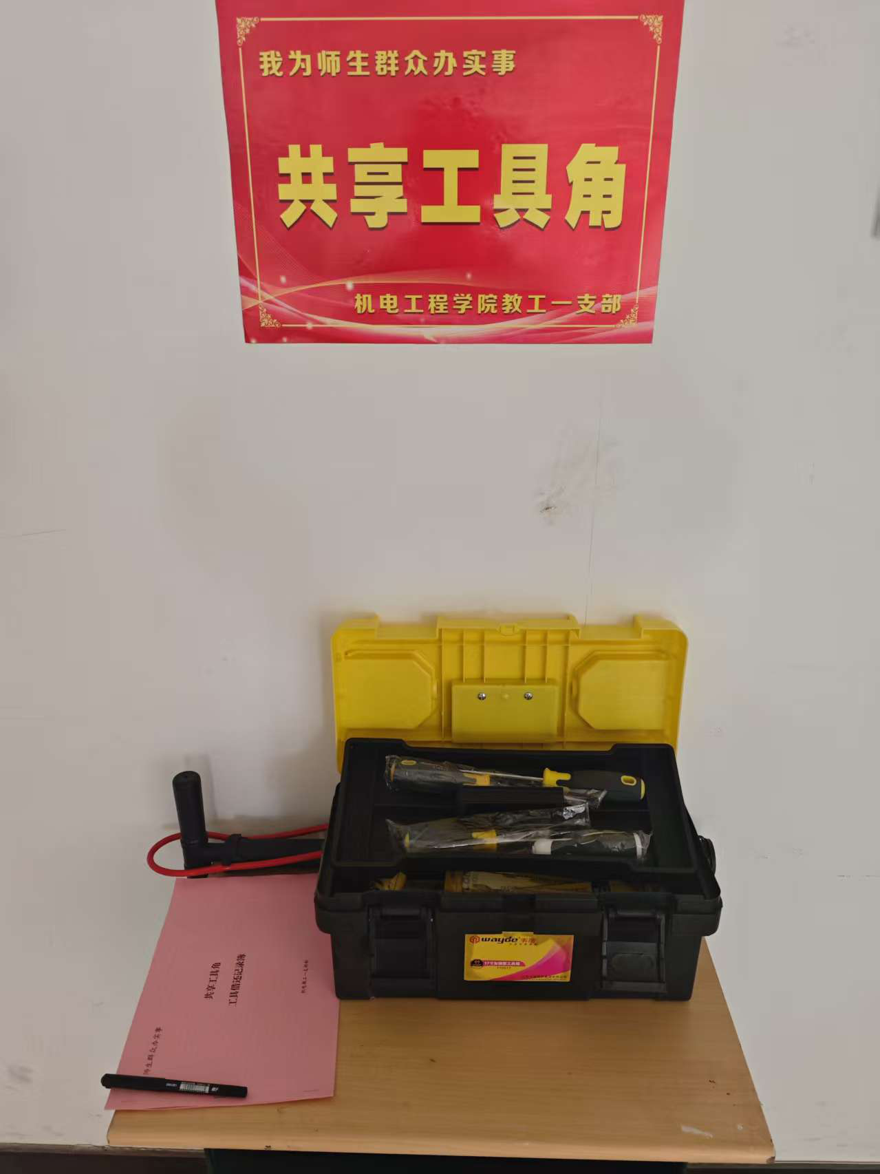 “师生在日常实验、发明创造或生活中,常遇到急需扳手、螺丝刀、打气筒等小型工具却无处借的困扰。”支部书记李培民介绍,通过前期调研收集师生意见,支部决定以“小切口”解决“大问题”,在理工楼4楼资料室门口设立“共享工具角”,让工具“触手可及”。走进“共享工具角”,规整摆放的工具彰显贴心设计:黑色塑料工具箱分层收纳-上层是两把黄黑相间、透明包装的螺丝刀,下层是黄色与银色搭配的扳手组合套装;工具箱旁立着一个黑色打气筒,红色软管整齐缠绕,随时可应对自行车、电动车、篮球以及排球等球类充气需求。工具箱红黑把手方便取用,细节处尽显实用考量。
